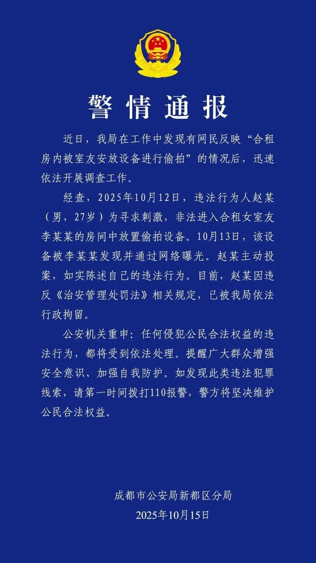 经查,2025年10月12日,违法行为人赵某(男,27岁)为寻求刺激,非法进入合租女室友李某某的房间中放置偷拍设备。10月13日,该设备被李某某发现并通过网络曝光。赵某主动投案,如实陈述自己的违法行为。目前,赵某因违反《治安管理处罚法》相关规定,已被我局依法行政拘留。